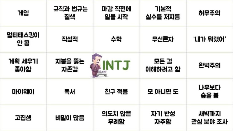 MBTI 16가지 유형중 INTJ에 연관하여 알아봤는데요