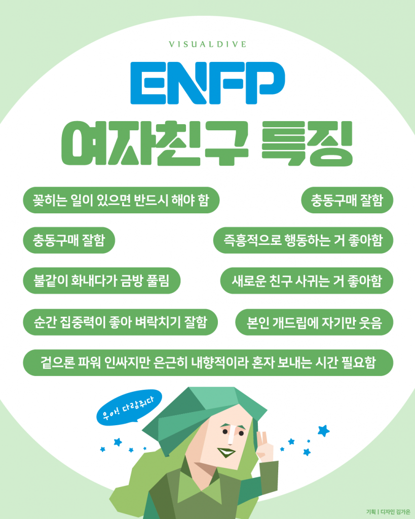 ENFP-A 유형은 독립적이고 자유로운 영혼의 소유자로 자신의 인생을 무한 긍정적으로 바라보는 편입니다.