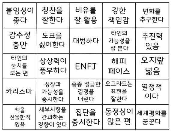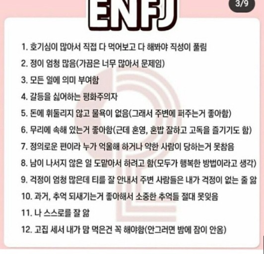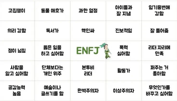 하지만 ENFJ 유형들은 카리스마 있으며 사람들을 따스하게 이끄는 타고난 리더라 ENFJ-T 민감성이 겉으로 보기엔 표기가 잘 안 날 수도 있답니다.