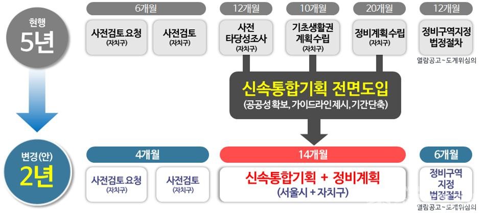 정비구역으로 지정하는 데 걸리는 시간을 5년에서 2년으로 단축하고, 사업시행 시 걸리는 기간도 절반으로 단축이 예상돼요.